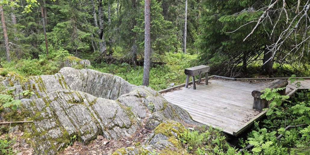 Mutta arvatkaapa mitä! Otin kirjan käteeni ja vilkaisin sen tekstiä. "Huomio! Luontopolku jättää hiidenkirnun huomioimatta." Juuri Linnénpolun kyltin kohdalla vasemmalla on puinen ja esteetön kävelysilta, joka vie hiidenkirnulle. Olipas kiva, että tämä asia tuli luettua. Palasin muutaman metrin takaisin ja löysin hiidenkirnun katselulavoineen.