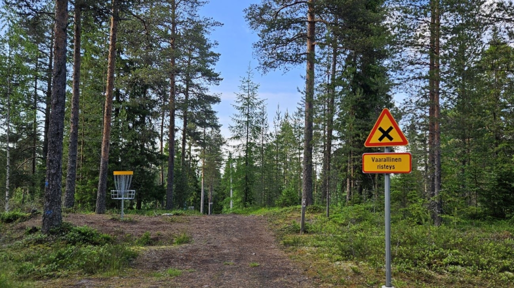 Pian ollaankin jo loppumetreillä. Vaarallinen risteys ja frisbeegolf-maali ovat viimeisiä kylttejä ennen luontopolun "maalia". Viimeiset 50 metriä kuljetaan samaa reittiä kuin alkumetreillä.