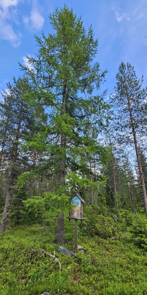 Onneksi luin kirjaa. Se kertoi, että ensimmäinen luontopolun infotaulu lehtikuusesta olisi 330 metrin kohdalla. Täsmälleen!