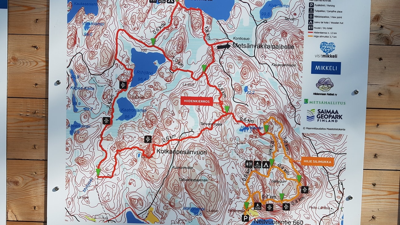 Reittikartasta otin myös kuvan. Tässä vaiheessa en ollut varma, kävelisinkö koko Hiidenkierroksen vai vain oranssilla merkityn Hiijje Silimukan (jonka kirjoitusasu näköjään vaihtelee, tässä kartassa yhdellä j-kirjaimella).