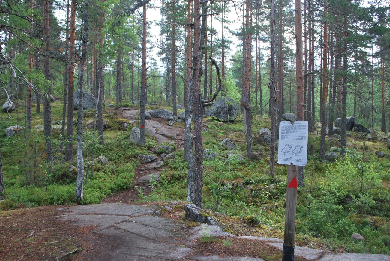 Korkeimmalla kohdalla ollaan jo noin 100 metriä korkeammalla kuin lähtöpisteessä! Täältä löytyi myös melko kulunut kyltti silokallioista. Kalliosta voi kuulemma löytää myös 1800-luvulla päivätyn kirjoituksen, sitä en valitettavasti havainnut.