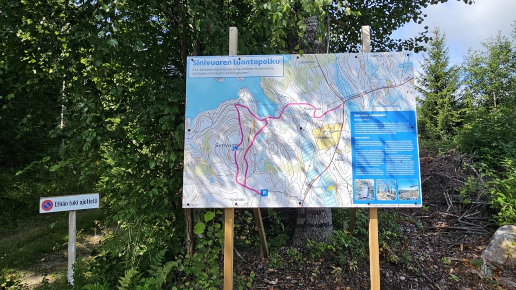 Aiempi pysäköintipaikka ja lähtöpiste Rutakoskentien laidassa oli yhä käytössä, mutta uusi luontopolun esite tarjoaa kuitenkin pysäköintipaikkaa Sinimäentien varresta. Sinne siis. Auto parkkiin ja ihailemaan uutta reitin opastaulua. Parkkipaikka on reitin eteläisimmässä kohdassa. Aiemmin reitti lähti koilliskulman tienristeyksestä, kulki vastapäivään Sinivuoren yli ja jatkui Rutakoskentien tuntumassa ympyräreitin loppuun. Uusi ympyräreitti on tehty kokonaan Sinivuoren tuntumaan ja sen pohjoisreunalta voi tehdä pistoreitin koilliskulmaan. Päätin tehdä näin