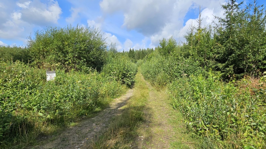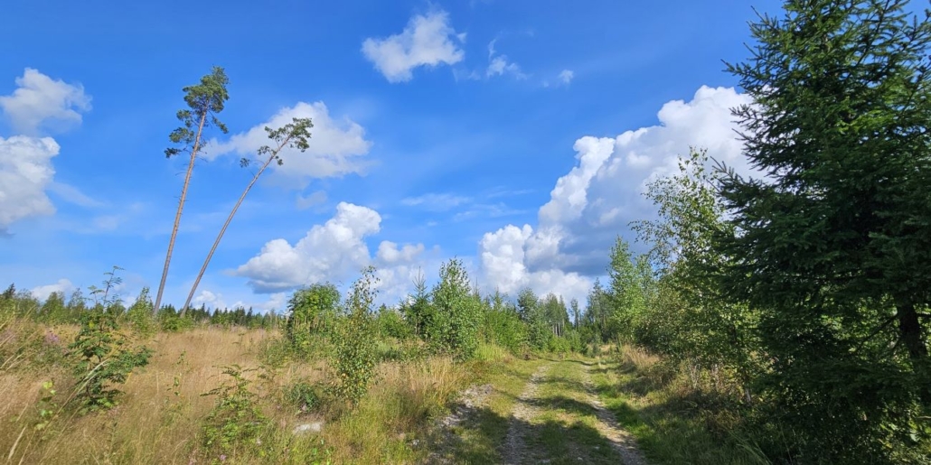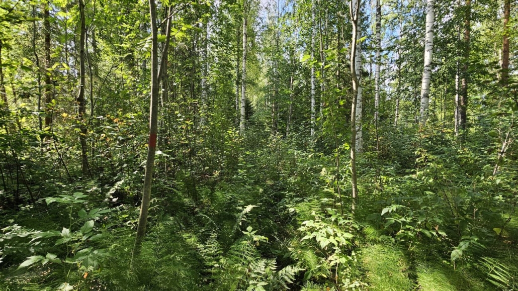 Pistoreitin viimeiset sadat metrit kuljetaan kuitenkin tätä mökkitietä pitkin. Tässä ohitetaan hakkuuaukea, johon on jätetty pari kuvauksellista siemenpuuta.