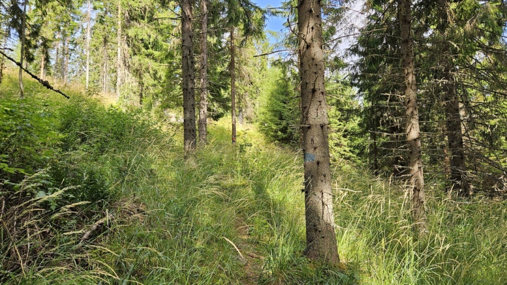 Kuvittelin, että tämä itäisempi reitti kulkisi Sinivuoren ohi, tasaisissa merkeissä. Olin väärässä, polku lähtikin nousemaan Sinivuoren rinteelle. Nousua kertyy parikymmentä metriä, ei sen enempää. Reitti on heinikkoinen. Opastaulu varoitteleekin runsaasta kasvillisuudesta. Pitkät lahkeet ovat tarpeen, ehkä myös vedenpitävät kengät. Punkkitarkastuksenkin tein aina hetkittäin, varmuuden vuoksi. Ainakin yhden kerran astelin myös heinikossa hetken väärään suuntaan. Polkua ei ole täällä kävelty niin paljon, että se näkyisi todella selvästi. Tarkkaavaisuutta tarvitaan.