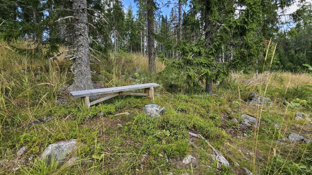 Noin 600 metrin kohdalla ollaan 30 metriä lähtöpaikkaa korkeammalla, tämän reittiosuuden korkeimmassa kohdassa. Tänne oli laitettu yksinkertainen penkki. Itään aukeavaa maisemaa voi istahtaa hetkeksi ihailemaan. Huomasin myös sinisen merkinnän "kota->" yhdessä penkin lähellä olevassa kuusessa. Tästä kulkisi siis oikopolku Sinivuoren huipulle ja siellä sijaitsevalle kodalle.