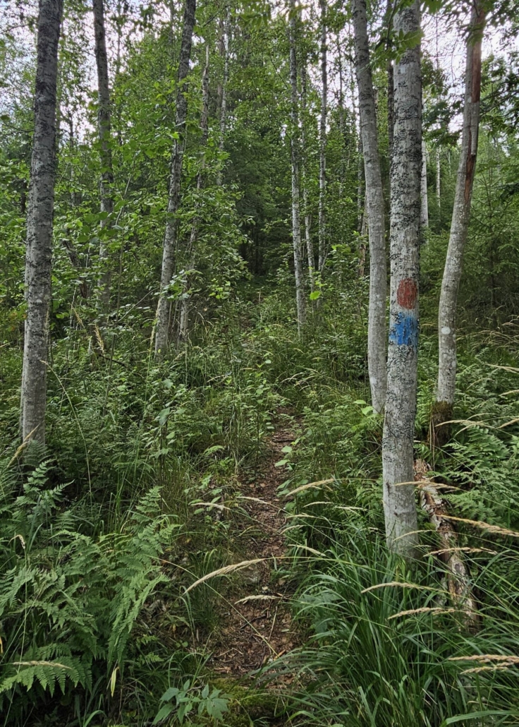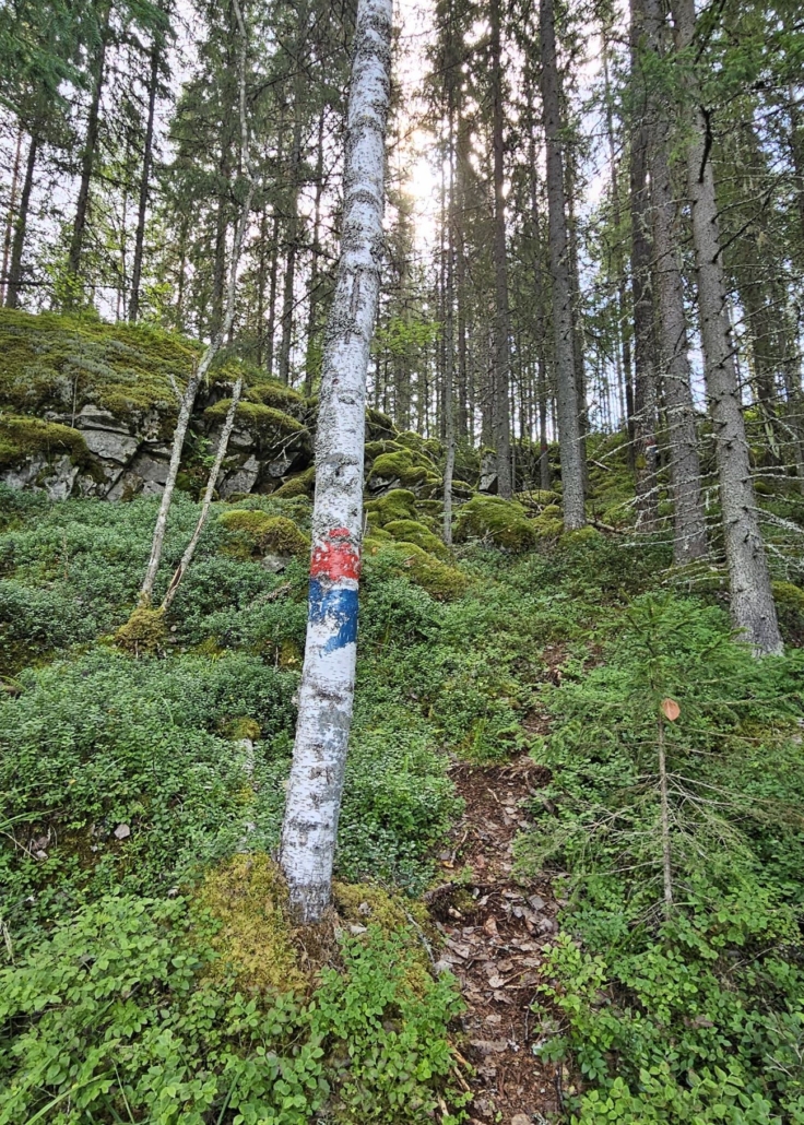 Ympyräreitti alkaa noin 200 metrin kohdalla. Risteyksessä on vielä toinen opastaulu reittikarttoineen. Päätin kiertää reittiä vastapäivään, jotta Sinivuoren huippu ja sen taukopaikka osuisi kävelyn loppumetreille. Vastapäivään kuljettaessa tieosuus jatkuu vielä noin 200 metriä, sen jälkeen polku kääntyy vasemmalle metsään. Reittimerkinnät ovat opastaulun mukaan sini-puna maalia, kuten vasemman laidan tolpassa ja koivunrungossa ehkä näkyykin.