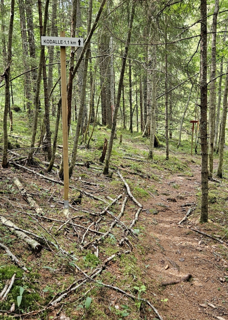 Edellisellä käynnillä täällä oli myös taulu, joka "ehdotti" vaihtoehtoista polkua reitin varrella oleva kesämökin pihan ohittamiseksi. Nyt mökkitietä pitkin menevää reittiä ei enää ollut vaihtoehtonakaan. Polku kiertelee hetken kosteahkossa metsässä, jossa polku oli taas hieman hankalasti havaittavissa. Maalimerkintöjä oli onneksi tarpeeksi ja pysyin polulla.
