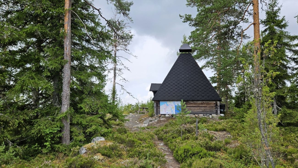 Lopulta sadan metrin nousu alkoi loppua ja lehtimetsä vaihtui paljon avoimemmaksi mäntymetsäksi. Sinivuoren kota näkyi edessäni. Esitteessä kerrottiin, että tässä vaiheessa "retkeilijä voi päästää pienen ilon huudahduksen juuri tehdystä saavutuksestaan" - ehkäpä vähän tuuletinkin nousun kunniaksi. Kodan lisäksi mäen päältä löytyy pöytä ja penkit, vessa ja puuliiteri.