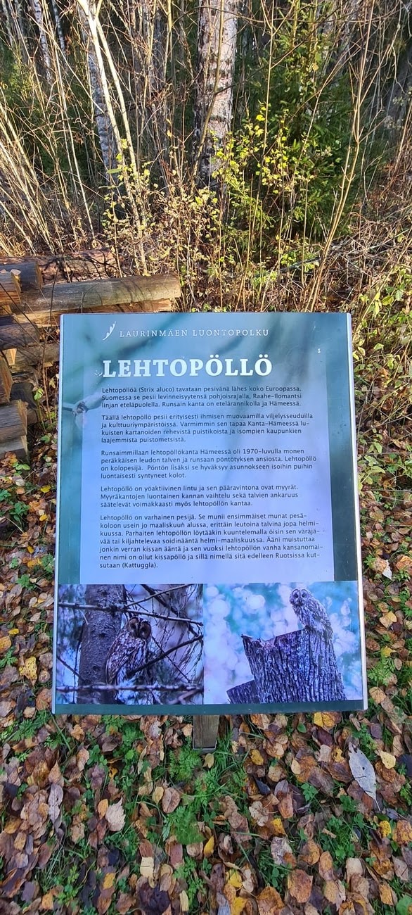 Reitin varrella on paljon opastauluja, joissa kerrotaan alueen historiasta ja luonnosta. Ensimmäinen opastaulu kertoi lehtopöllöstä.
