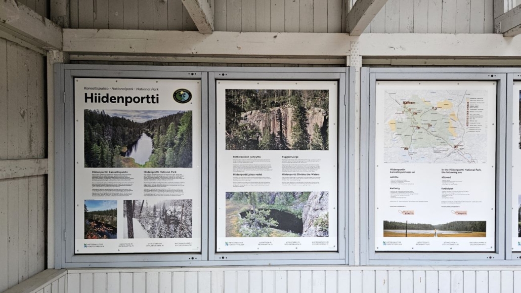 Risteyskohta yhdeksän kilometrin jälkeen. Hiidenportin rotkolaaksolle on vain sata metriä, mutta Kitulankierros kääntyy tässä vasemmalle kohti Kovasinvaaraa. Toki rotkolaaksolla on helppo piipahtaa vielä toiseen kertaan, jos siltä tuntuu.
