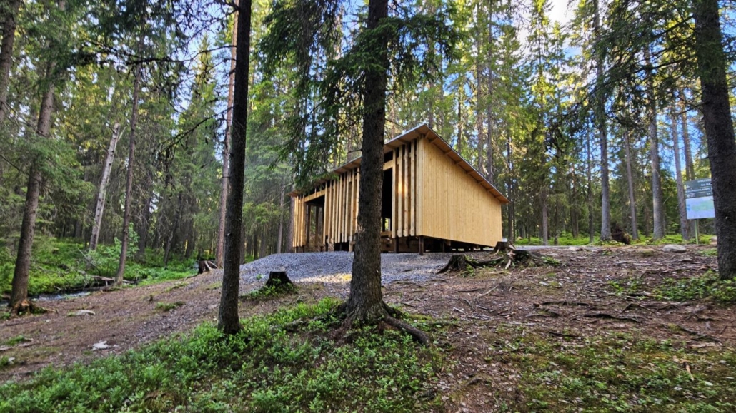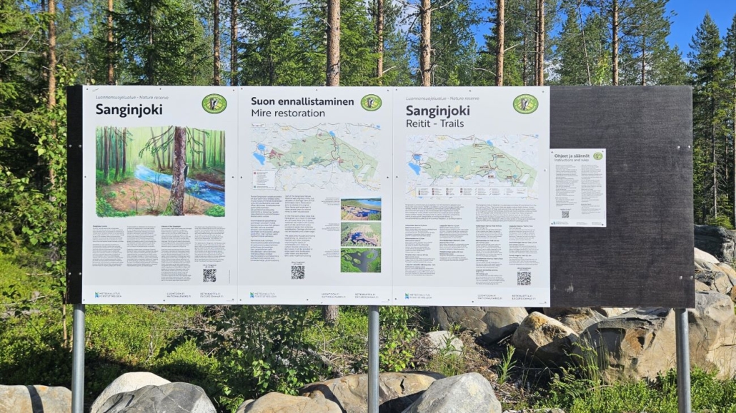 Ajelin siis Nuutinpalon pysäköintialueelle Ylikiimingintien varrelle. Tilaa on kymmenille autoille, paikalla oli myöhäisenä sunnuntai-iltapäivänä viitisen autoa. Tutustuin opastauluun, jossa Sanginjoki-tietouden ja kartan lisäksi kerrotaan suon ennallistamisesta. Sanginjoen alueesta puolet on alunperin ollut suota, mutta ojituksen seurauksena suot olivat jo lähes hävinneet. Ennallistamisessa alueen puustoa on karsittu ja luotu kosteikkoja, jotka estävät kiintoaineen valumisen vesistöihin. Ojien tukkiminen tapahtuu myöhemmin. Kalimeenkierroksen varrella on pari ennallistamiskohdetta.