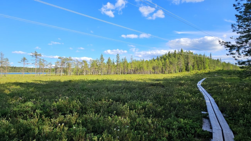 Ja sen jälkeen kauniille avosuolle. Lampi on muutaman kymmenen metrin päässä. Suolla hohtavat vihreän ja keltaisen eri sävyt, lampi ja taivas kirkkaan sinisinä. Hieno paikka. Blogin pääkuva on sekin otettu tästä pitkososuudelta.