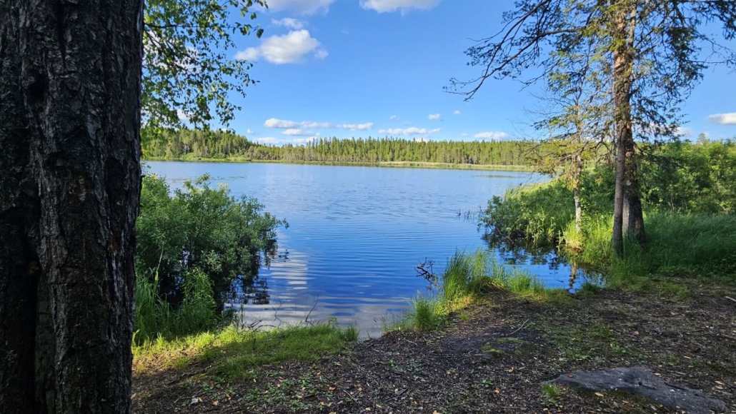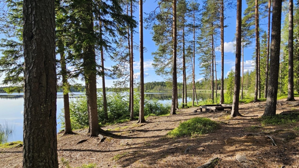 Lammen itärannalta löytyy toinen taukopaikka, johon istahdin jo hetkeksi juomatauolle. Ilta-aurinko valaisee tämän mäntymetsässä sijaitsevan nuotiopaikan kauniisti.