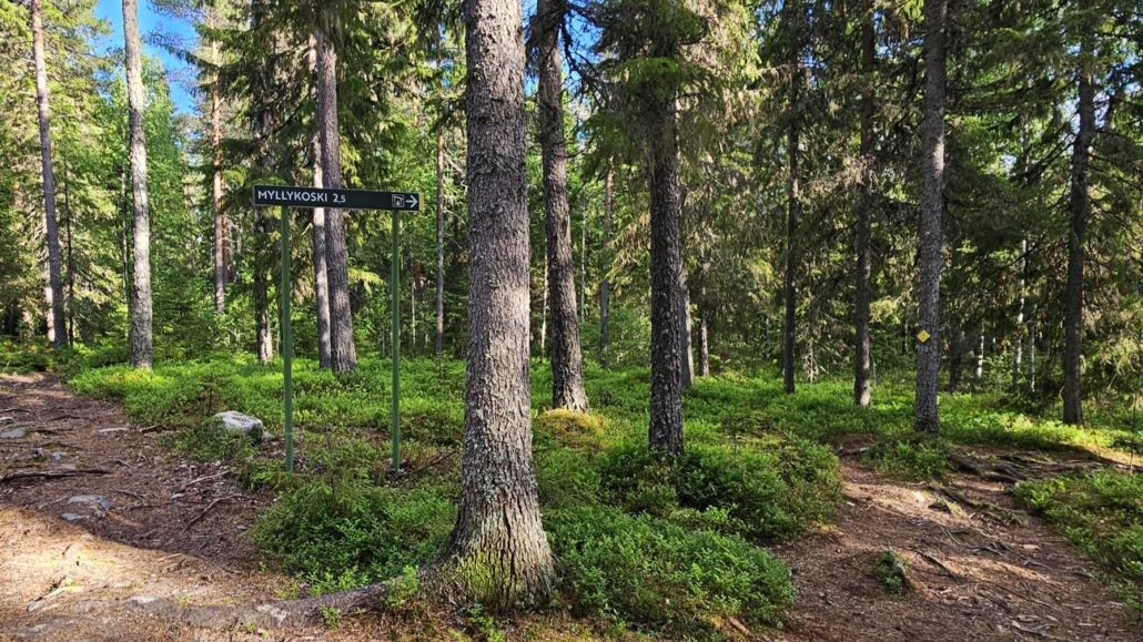 Tauon jälkeen palasin reitille. Huomasin tässä, että taukopaikalta lähti melkoinen määrä polkuja, jotka kaikki näyttivät lopulta tuovan ympyräreitin varrelle, joten pieni oikaisu on mahdollinen. Taukopaikalta ei tosin muutenkaan ollut kuin reilut sata metriä viralliselle kierrokselle. Kolmisen kilometriä takana, Myllykosken seuraavalle taukopaikalle nuolen mukaan 2,5 km.