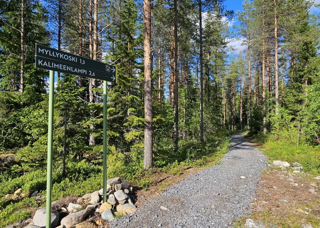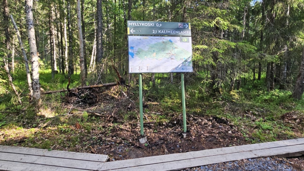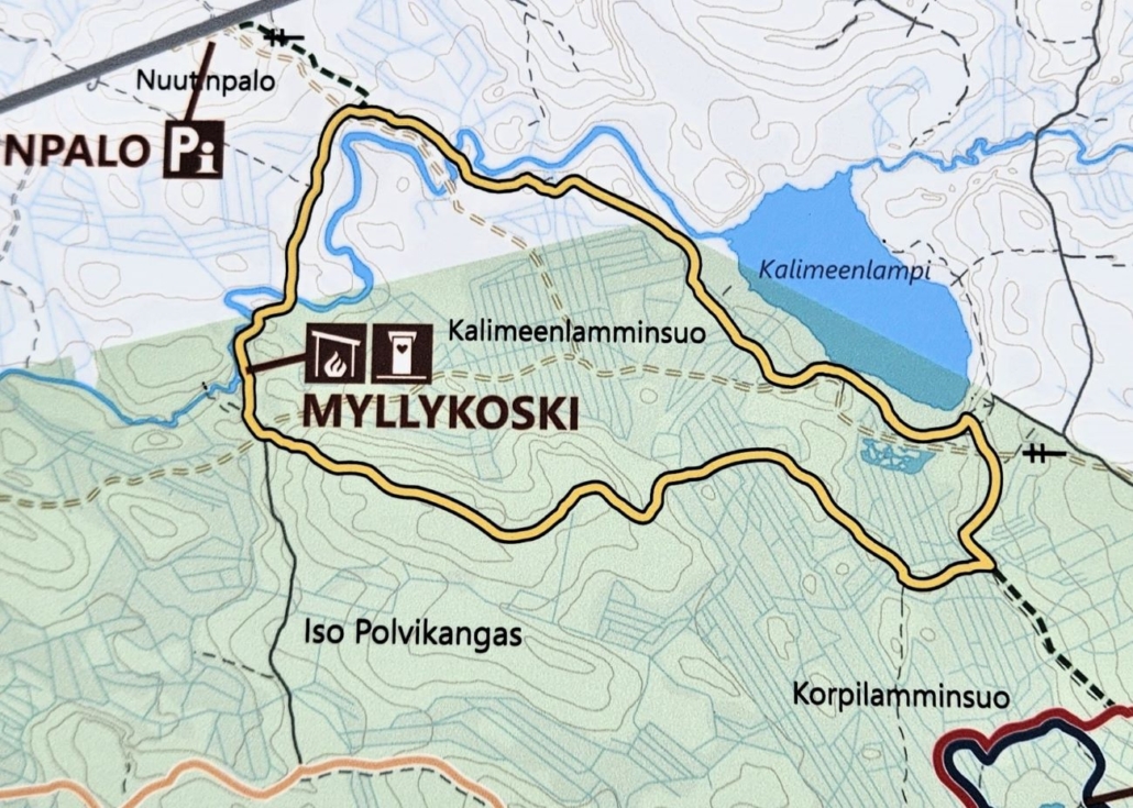 Kalimeenkierrokselle lähdetään siis Nuutinpalon pysäköintipaikalta, josta on lyhyt janareitti varsinaiselle kierrokselle. Luontoon.fi -sivun mukaan suositeltu kulkusuunta on myötäpäivään, jolloin Myllykosken taukopaikka jää reitin loppupuolelle. Kalimeenlammella on tosin parikin mukavaa taukopaikkaa, jotka reittikartasta puuttuvat.