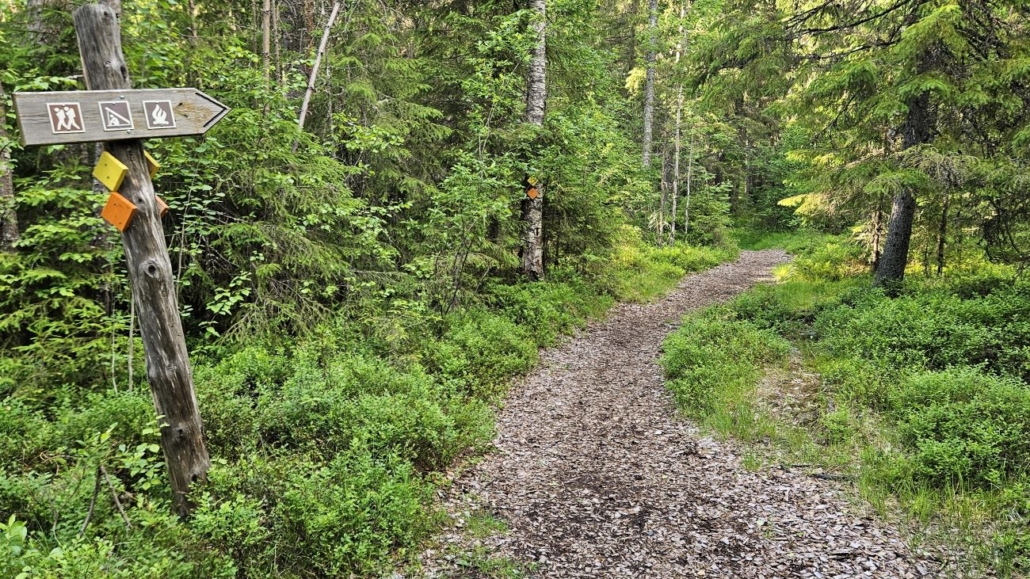 Reitti alkaa pysäköintialueen itälaidalta. Janareitti alkumatkalla on kokonaan sorastettu. Olin siis kävellyt muutama päivä aikaisemmin Loppulan kierroksen, joka oli koko matkalta leveähköä sorapolkua - aloin jo miettiä, mahtaisivatko kaikki Sanginjoen reitit olla näin helppokulkuisia. Suoraan sanoen toivoin, että välillä saisin kulkea ihan tavallista metsäpolkuakin pitkin.