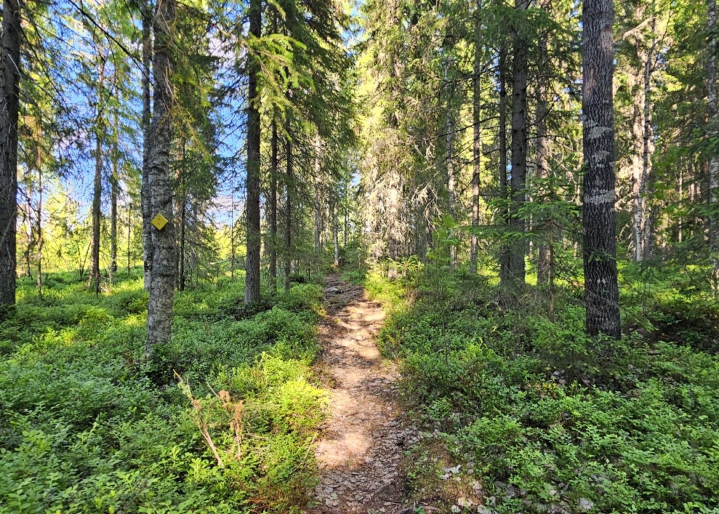 Hetken päästä kuljetaan jo ihan tavallisella metsäpolulla. Täällä kuljetaan suurelta osin vanhoissa sekametsissä. Reittimerkinnät ovat keltaisia vinoneliöitä.