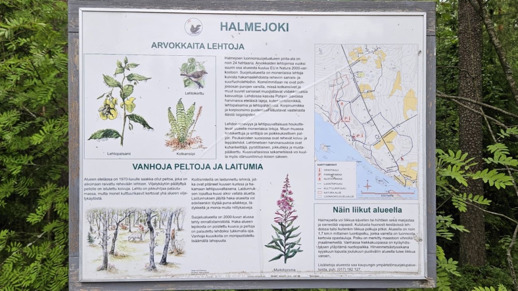 Halmejoen opastaulu kertoo paikan olleen 1970-luvulle asti peltoa ja laidunmaata. Suojelualue on noin 24 hehtaarin kokoinen. Karttaan on merkitty sekä Halmejoen luontopolku että samassa ympäristössä kulkeva kulttuuripolku. Luontopolku on hieman kahdeksikon muotoinen, se koostuu alkumatkan janareitistä sekä kahdesta lyhyestä ympyräreitistä. Kartassa se on alueen pohjoisin kävelyreitti.