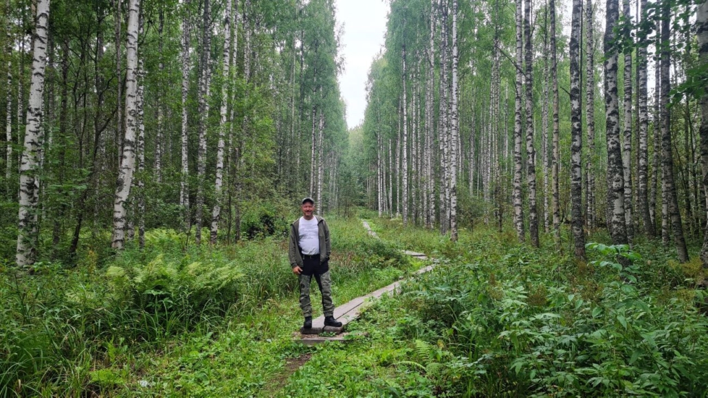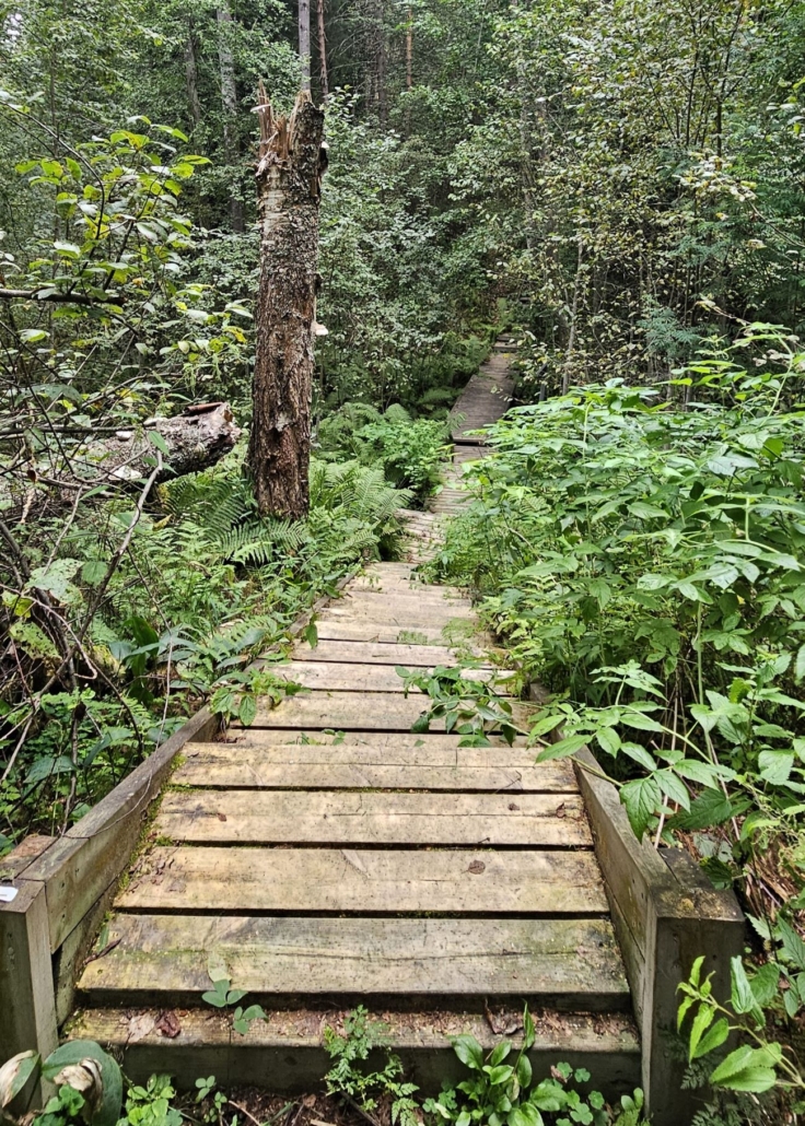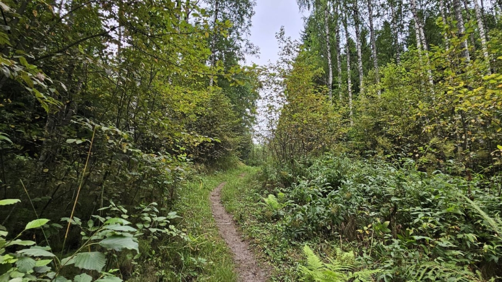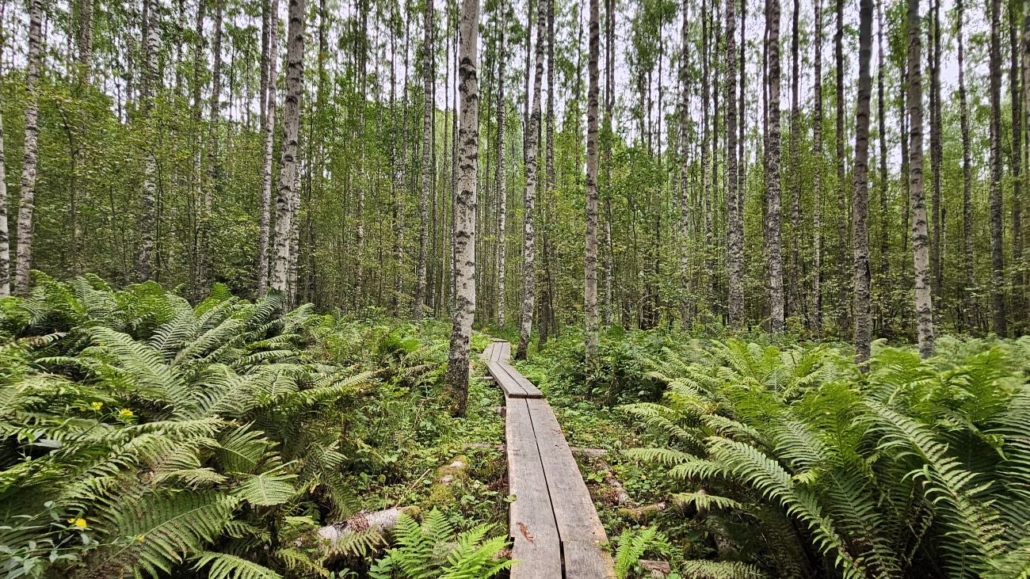 Reitti vie kerrassaan valloittavaan koivikkoon, jossa kuljetaan pitkoksilla. Keväällä täällä voi toki ollakin melko kosteaa. Elokuussa täällä oli kuivaa ja pitkosten ulkopuolellakin voisi tallustaa. Elokuussa oli myös melko hiljaista, mutta voin kuvitella paikan touko-kesäkuussa, kun linnut pitävät konserttiaan.