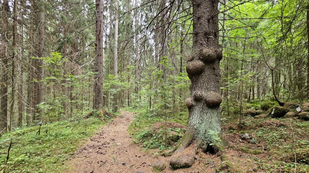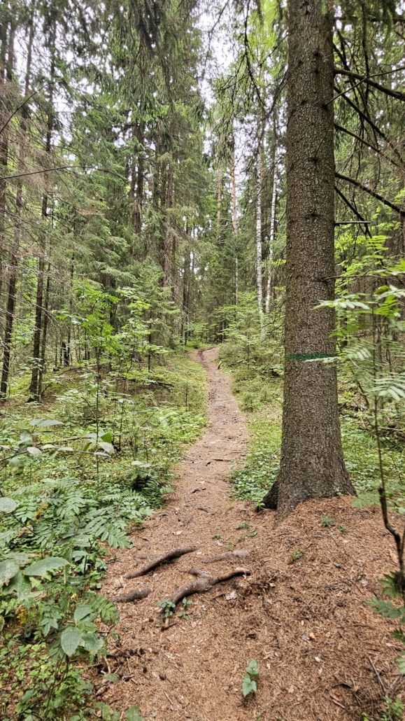 Purolaakson ylityksen jälkeen alkaa toinen ympyräreitti. Päätimme kiertää senkin myötäpäivään. Tämä on kuusikkoa, joka on joskus ilmeisesti toiminut laidunmaana. Tällöin paikka on pysynyt lehtipuuvoittoisena. Kuusi on vallannut alaa laidunnuksen jälkeen.