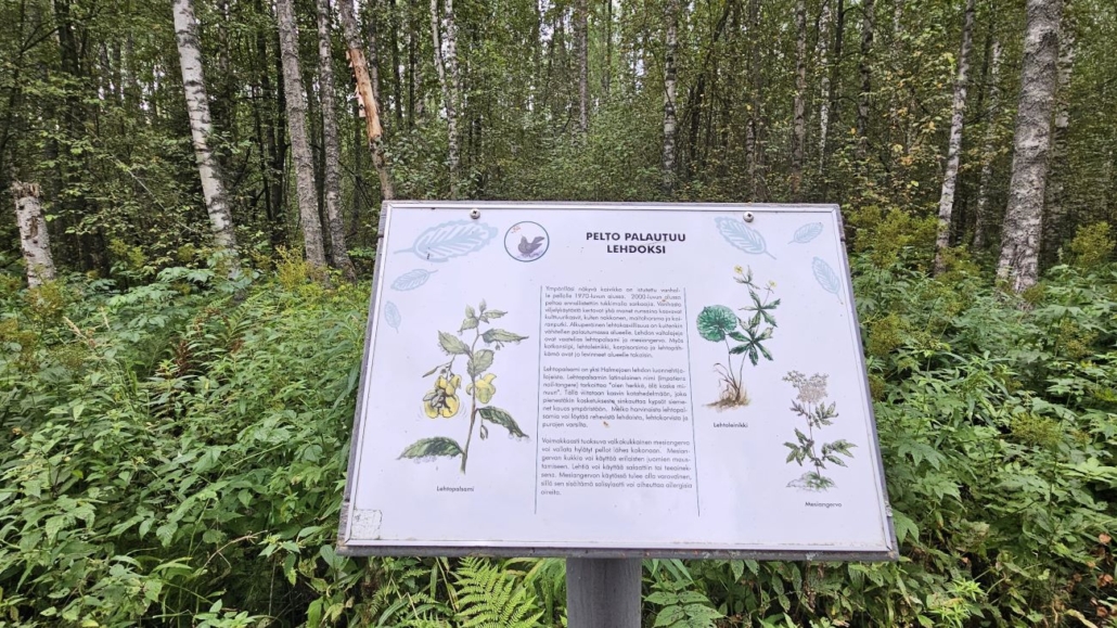 Luontopolkutaulu kertoo siitä, miten entinen pelto on muuttunut upeaksi lehdoksi. Koivikko on istutettu entiselle pellolle 1970-luvulla ja myöhemmin on myös tukittu entisiä ojia. Alkuperäinen lehtokasvillisuus on palautumassa alueelle, valtalajeina mm. lehtopalsami ja mesiangervo.
