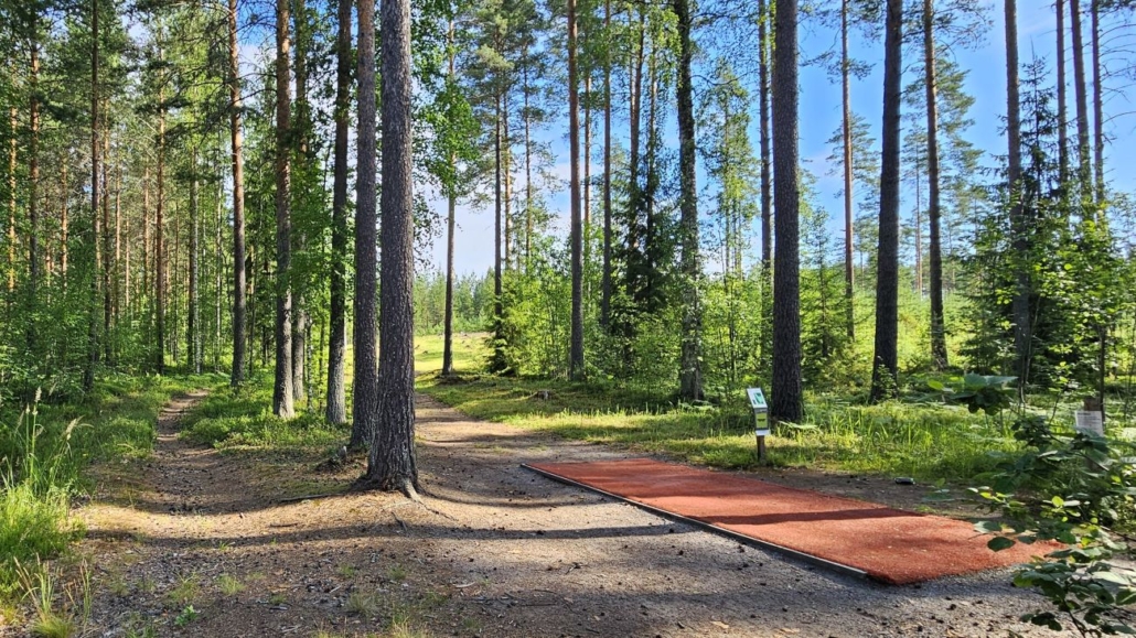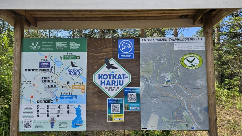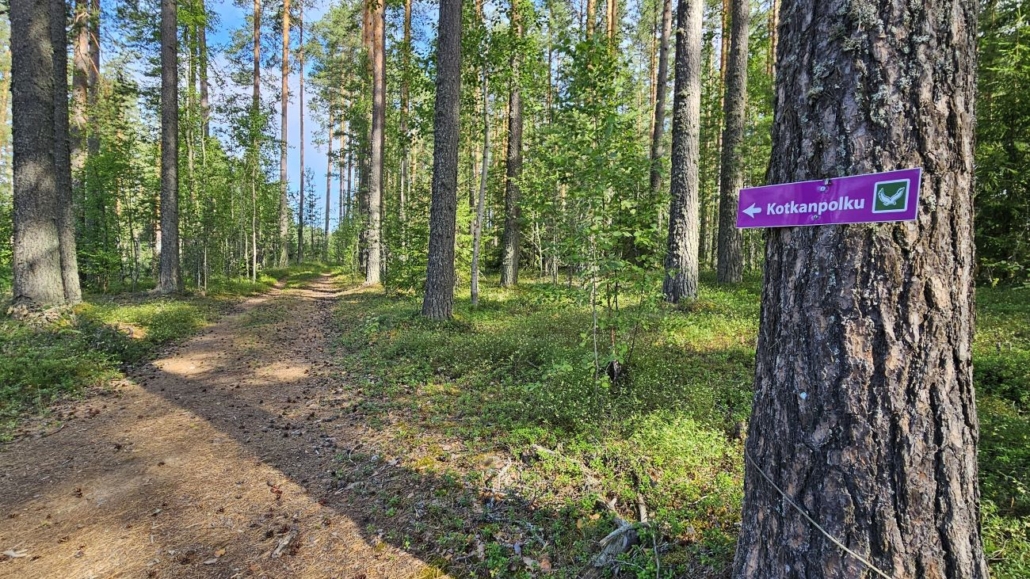 Näinpä sitten päätin käyttää heinäkuisen lauantaiaamun polkuun tutustumiseen. Hellepäivä tiedossa, joten suuntasin matkaan niin, että olin aloittelemassa kävelyäni noin kahdeksan maissa aamulla. Pysäköintipaikan vieressä oli opastaulu, joka oli sekin tietysti uusiutunut edellisen käyntini jälkeen. (Ja mainittakoon vielä, että tämän opastaulun vieressä oli mielestäni uusi rakennus, Kotkanmaja. Sitä voi vuokrata erilaisiin tapahtumiin.)