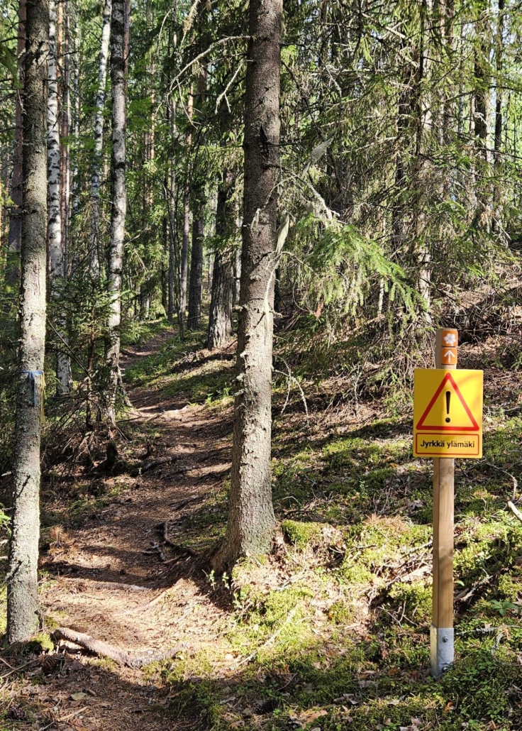 Reitti kulkee vielä hetken aikaa nuoressa metsässä, mutta sitten alkaa mielestäni mielenkiintoisin ja hienoin osuus. Noustaan Likolamminharjulle. Kyltti varoitteli jyrkästä ylämäestä. Kun samaan aikaan lämpötila alkoi jo lähennellä hellelukemia, niin kuumahan tässä nousussa meinasi jo tulla.