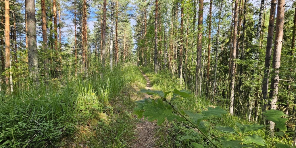 Harjun laella kävellään melkein kilometrin verran. Harjut saattavat usein olla melko kuivaa maastoa ja lähes pelkästään mäntykangasta puolukan- tai mustikanvarpuineen. Täällä oli huomattavasti rehevämpää. Lehtipuita, jopa tammia. Polun laita oli heinikkoinen.