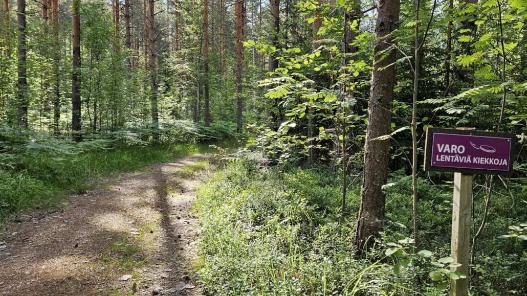 Frisbeegolfväyliä on taas parikin tässä reitin lähistöllä. Onneksi kävin lukaisemassa tämän väylän vieressä olleen valkoisen taulun tekstin. Olinhan minä sitä miettinytkin: missä ne kangasvuokot täällä ovat? Taulu kertoi, että väylän korin vieressä kasvaa kangasvuokkoja ja niitä tulisi varoa. Heittäjiä ei juuri nyt ollut paikalla, joten päätin käydä katsomassa.