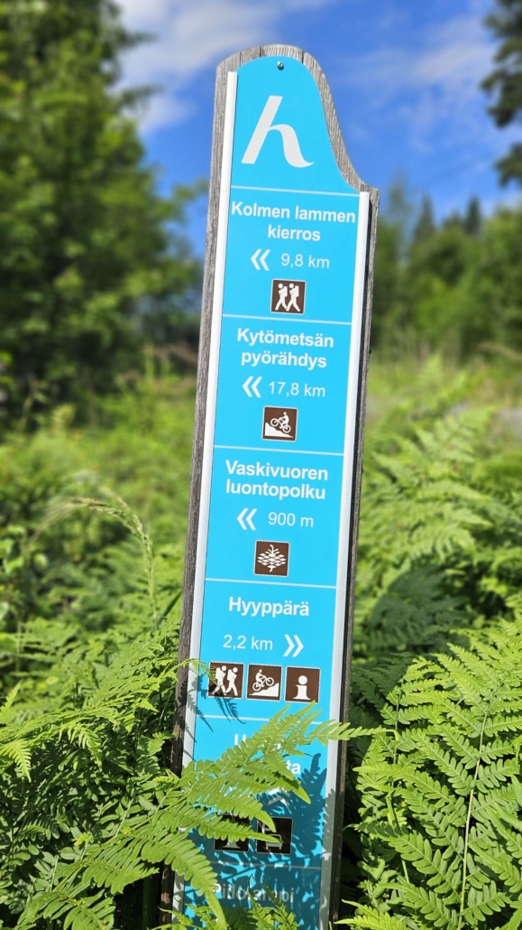 Nämä Hyvinkään luontopolkujen tutut siniset tolpat johdattavat kohti kolmea lampea. Risteyksissä kannattaa seurata nuolia.