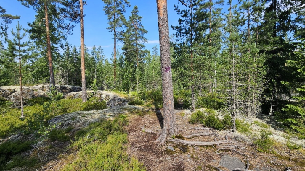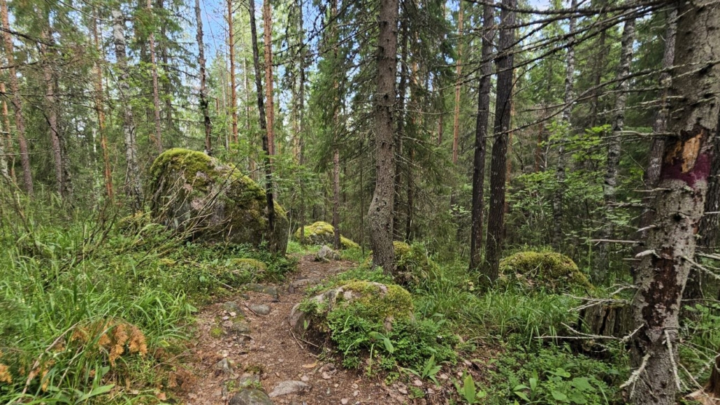 Valoisaa mäntykangasta tai kallioita reitillä ei juurikaan ole - paitsi tässä polkuosuuden alussa. Polku ylittää parikin kalliota.