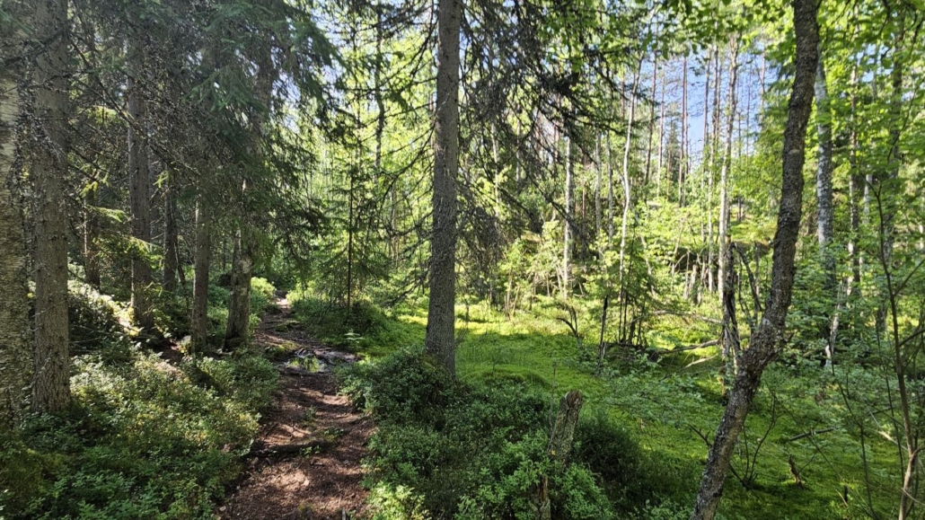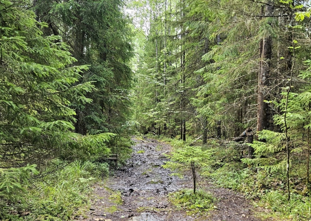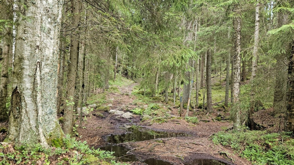 Kallioiden jälkeen reitti kulkee jonkin aikaa hyvin kosteissa laaksoissa. Alkukesä 2025 on ollut melkoisen kosteaa ja niinpä täälläkin oli paljon märkiä kohtia, joissa lenkkareiden kastuminen on melko todennäköistä. Sain väistettyä pahimmat paikat. Kuvan paikka ei suinkaan ole hankalimmasta päästä.