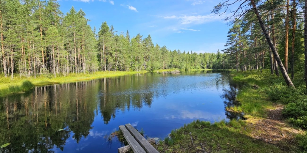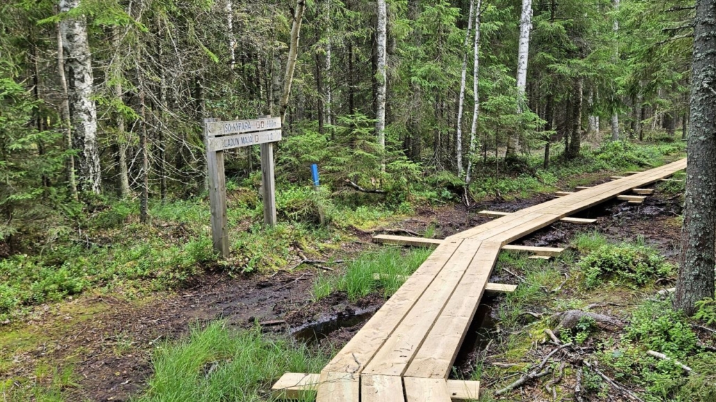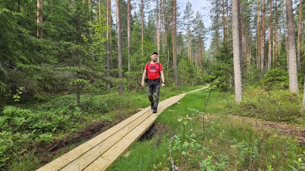 Tauon jälkeen matka jatkui Iso-Kypärän etelärantaa pitkin. Lammen itäisimmän lahden kohdalla poistutaan rannasta. Pitkospuut vaikuttavat uusilta.