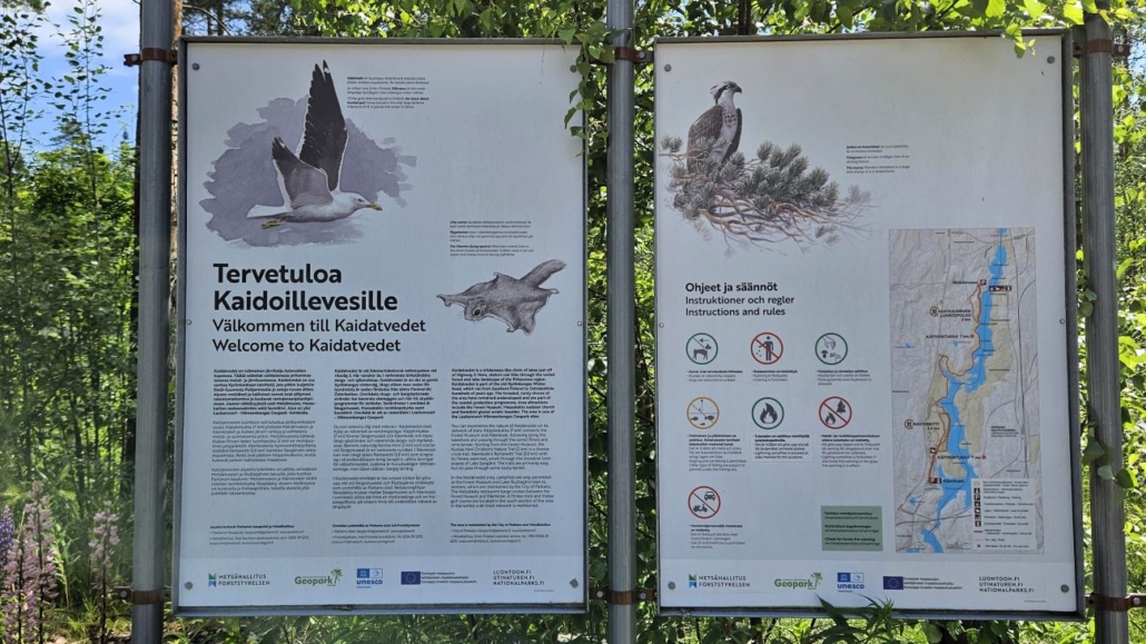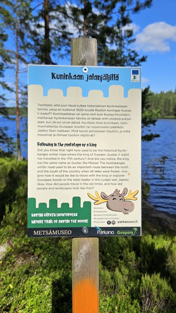 Ryhdyin tutkimaan opastauluja. Ollaan siis Kaitojenvesien rannalla. Se on useamman järven ketju, jonka kallioiset rannat kuuluvat järviensuojeluohjelmaan. Täällä voi retkeillä vanhalla Kyrönkankaan talvitiellä, jota pitkin on kuljettu eteläisemmästä Suomesta Pohjanmaalle jo satoja vuosia sitten. Tulenteko on muuten täällä sallittu vain kahdella laavulla, joista toinen sijaitsee täällä metsämuseon vieressä.