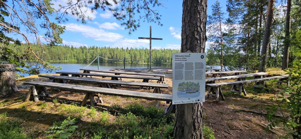 Ihan muutaman hetken päästä saavutaankin Messukalliolle. Tässä on toisenlainen infotaulu, joka sisältää sitten ihan oikeita faktoja tästä hienosta paikasta. Jääkausi on hionut Messukallion silokallioksi ja kuljettanut lohkareita kauemmaksikin. Paikalla on järjestetty jonkinlaisia jumalanpalveluksia, kun sää on estänyt venematkat kirkkoon asti. Paikalle on sittemmin rakennettu metsäkirkko.