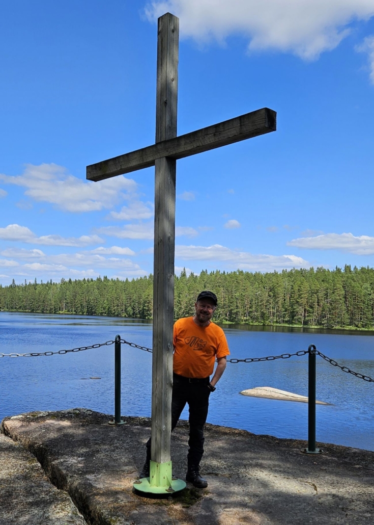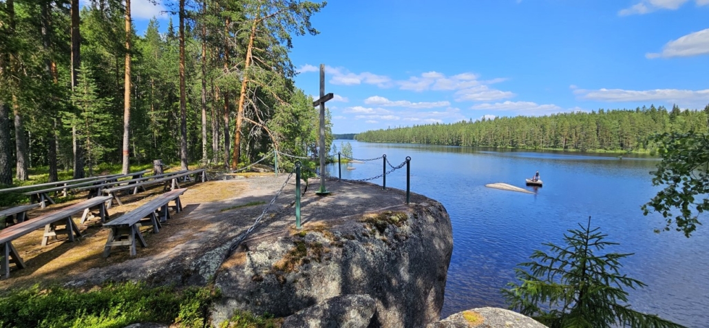 Vielä yksi kuva etelän suunnasta. Järvellä kalastettiin, muuten täällä oli rauhallista. Reitti lähtee tästä takaisin kohti pohjoista. Blogin pääkuva on otettu suurin piirtein ristin takana näkyvältä pieneltä ja matalalta kallioniemeltä.
