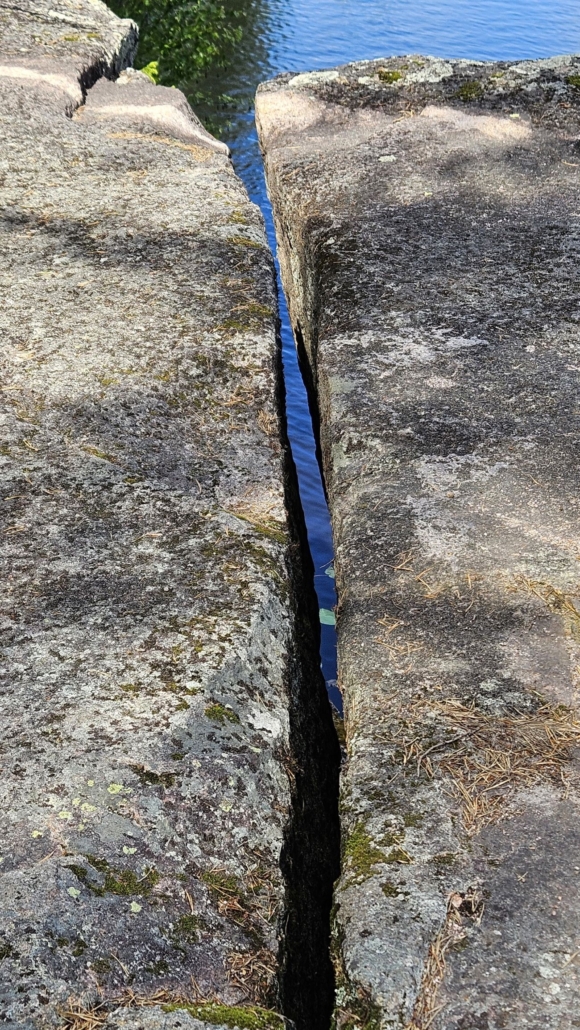 Osa tästäkin jyrkänteestä on irronnut erilliseksi lohkareeksi. Pieni halkeama näyttää jatkuvan monen metrin syvyyteen.
