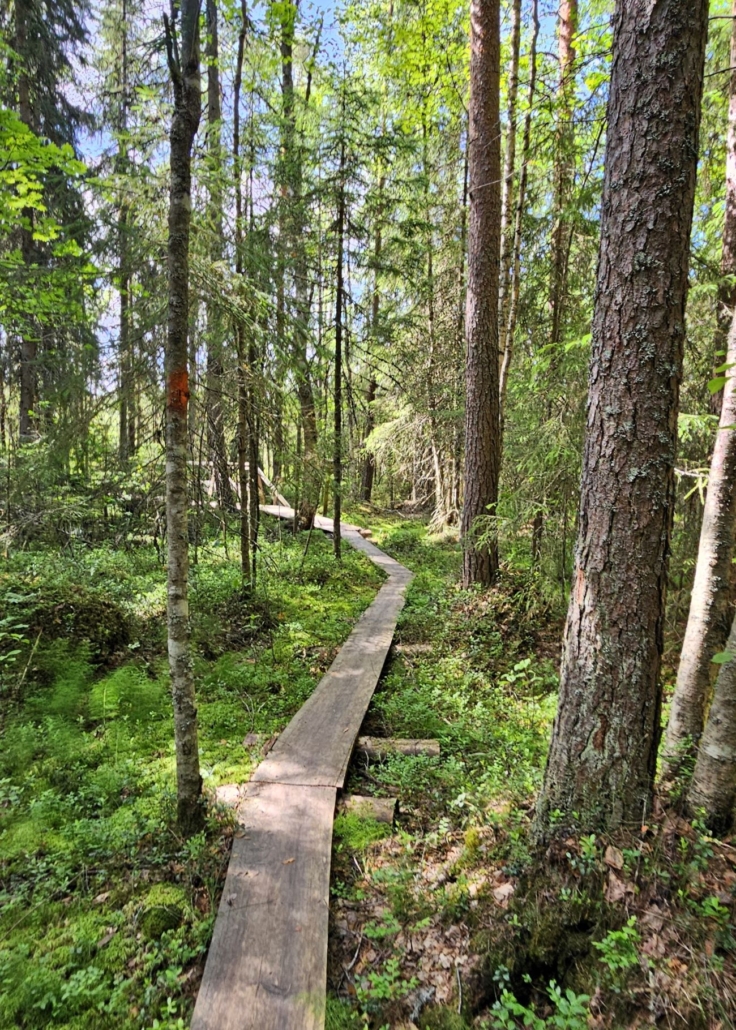 Parinsadan metrin kohdalla laskeudutaan suon laitaan. Täällä on lyhyt pitkospuuosuus.
