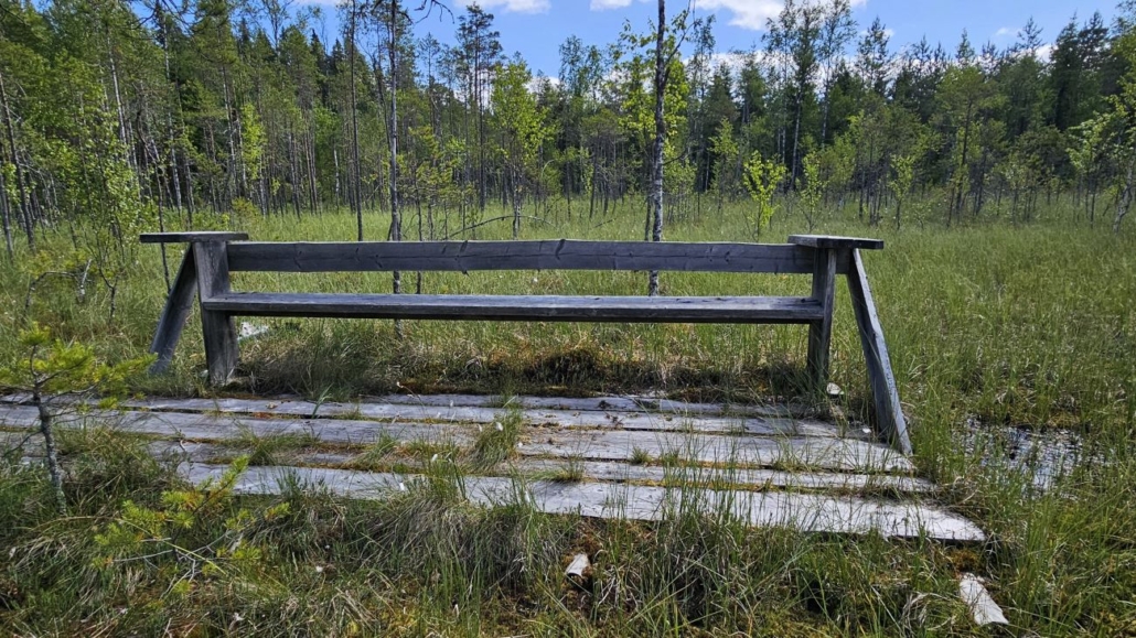 Ollaan Alainenneva-nimisen suon laidalla. Täällä on myös lyhyt pistopolku suon keskellä sijaitsevalle penkille.