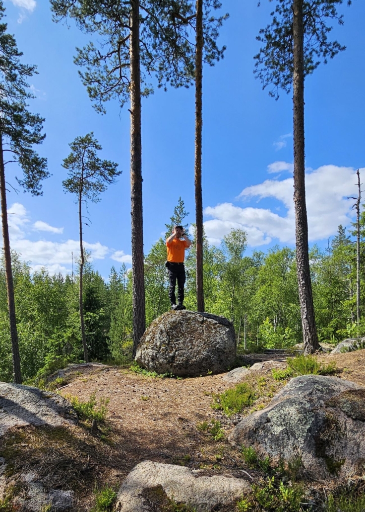 Tästä reitti nousee kukkulalle, jonka huipulla Kustaa-hirvi määrää katsomaan maisemaa käsikiikareilla. Minäkin tein työtä käskettyä.