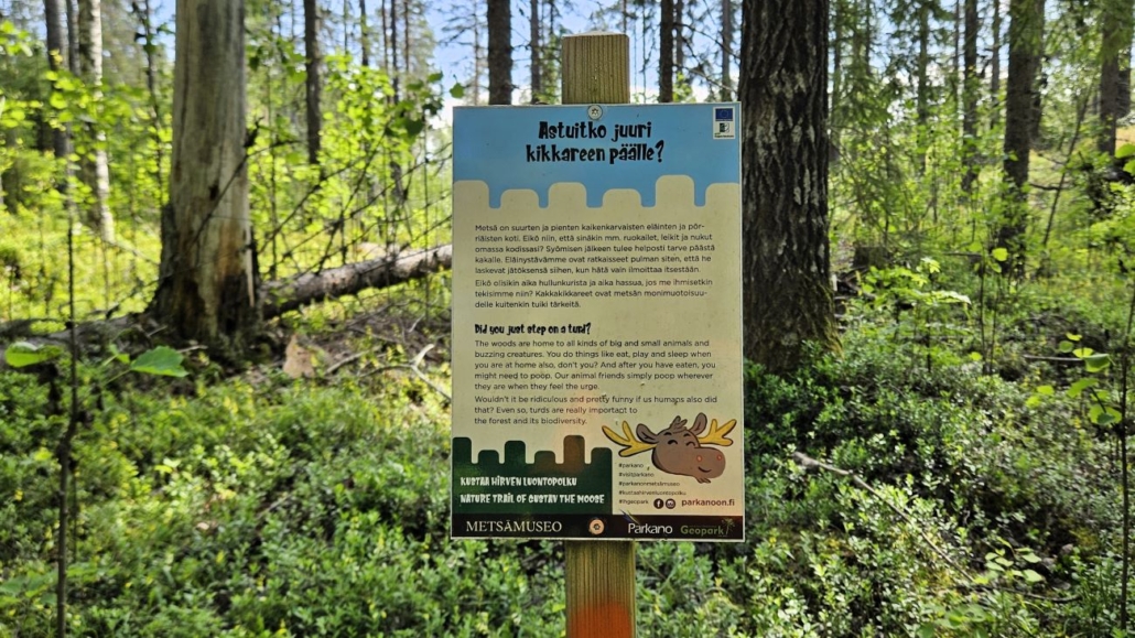 Meidän mielestämme hassuin toiminnallinen rasti oli tämä kikkareisiin liittyvä taulu. Siinä pyydetään miettimään millaista olisi, jos ihminenkin tekisi jätöksensä siihen, missä hätä ilmoittaa itsestään.