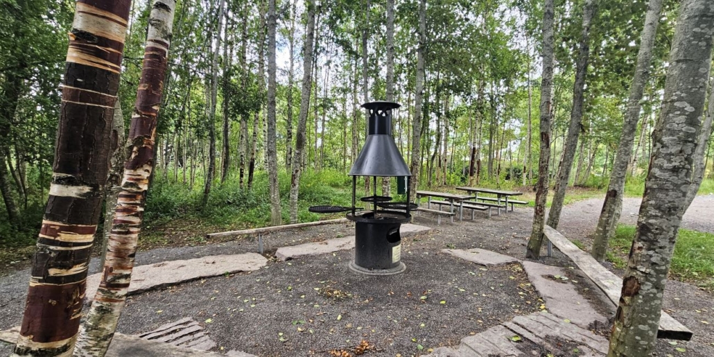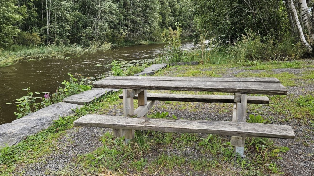 Tien laitaa pitkin kävellään reitin toiselle taukopaikalle. Tässä on evästelypöytä aivan veden äärellä. Kävelyä on takana alle puoli kilometriä.