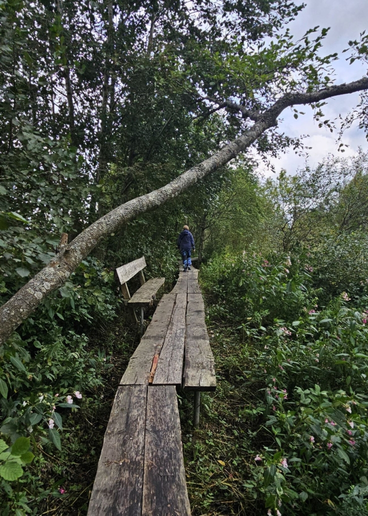 Reitti on helppo. Muutamat vinot pitkospuut taisivat olla reitin ainoa haaste. Korkeuseroja täällä ei ole. Maisema oli oikein miellyttävä, luonto oli rehevää, jopa hieman eksoottista. Koko retkeilyryhmämme nyökytteli päätään, tämä oli mukava kokemus.