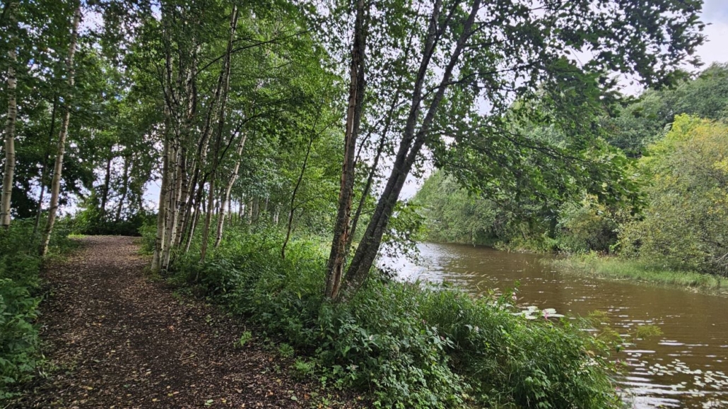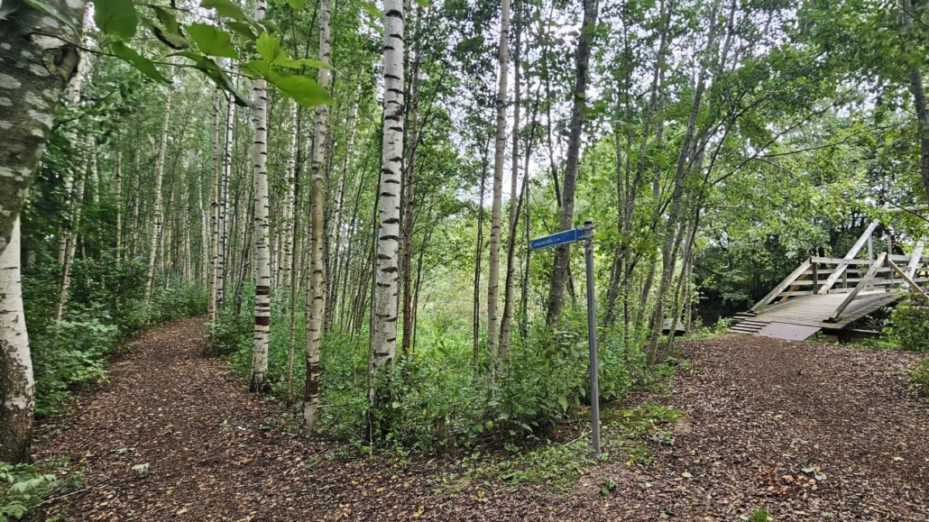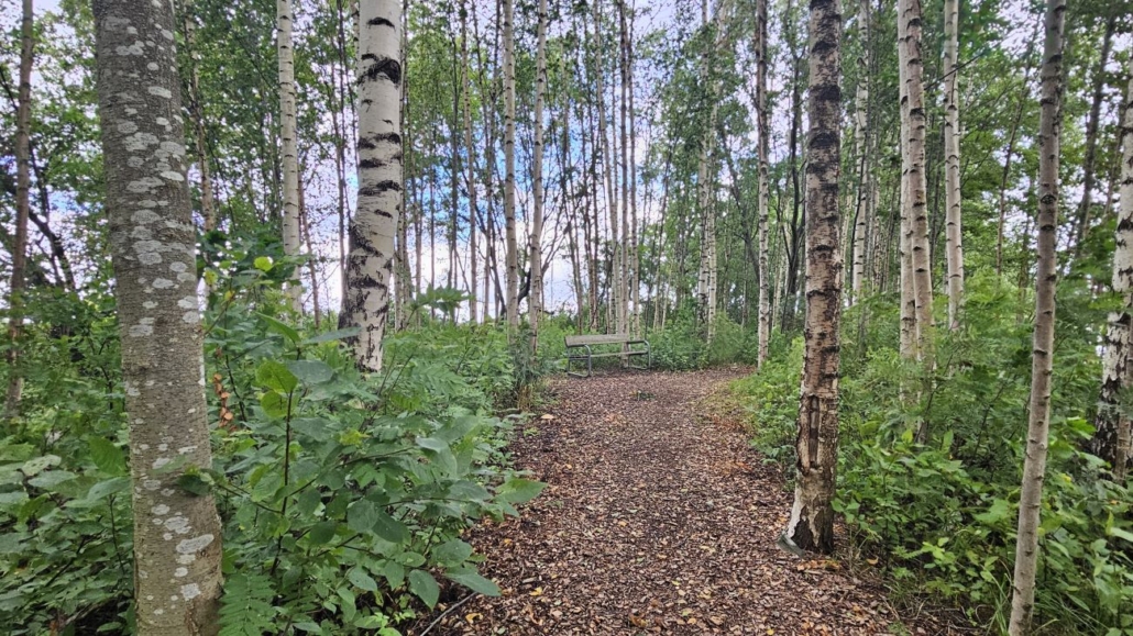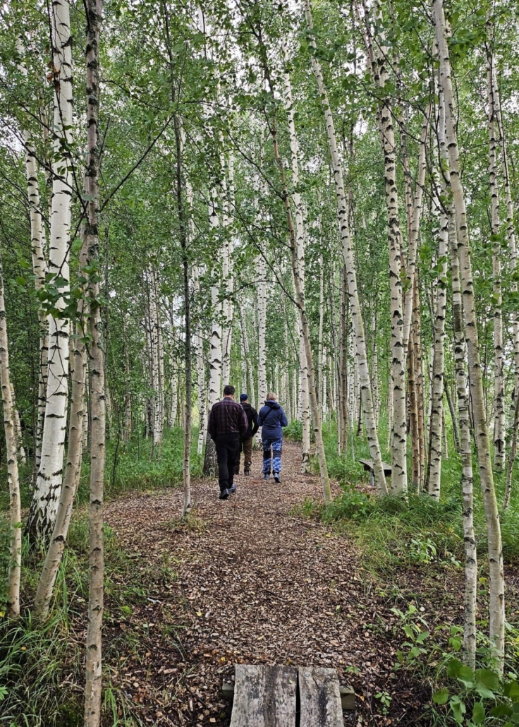 Seuraavaksi siirrytään taas kuivalle maalle ja haketetulle polulle koivujen katveessa.