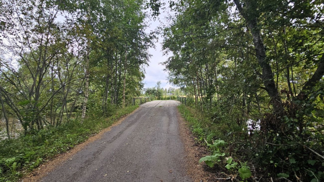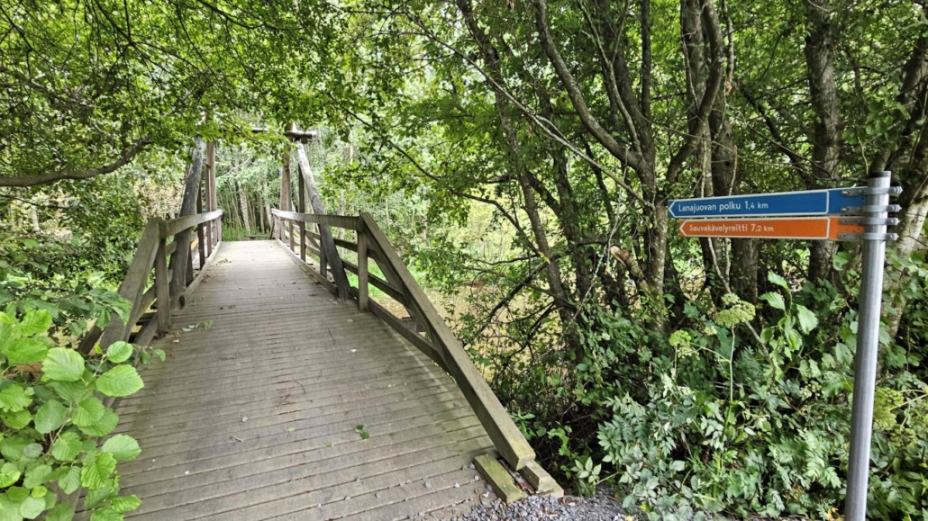 Sitten ollaankin jo reitin puolivälissä. Lanajuovantie ylittää tässä joen, samoin tämä pikku luontopolku. Ylityksen jälkeen ollaan Kvistinluodolla ja käännytään siis takaisin kohti kaakkoa.