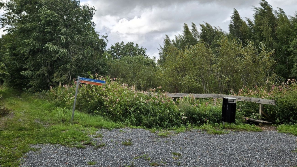 Lyhyt pätkä nimetöntä hiekkatietä ja sen jälkeen takaisin pitkospuille. Jättipalsamia kasvoi täällä valtavasti. Revimme niitä kymmenittäin irti, mutta meidän pikku talkootyöllämme tämä haitallinen vieraskasvi tuskin täältä vähenee.
