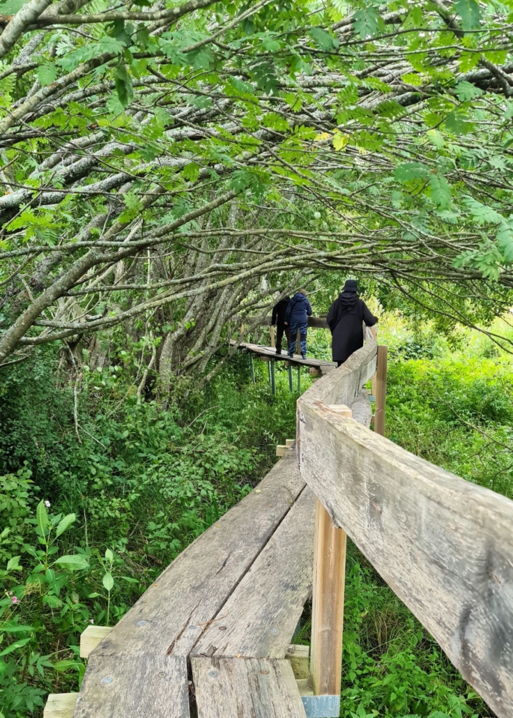 Tämä oli hauska osuus. Pitkospuut kulkevat tosi vinojen pihlajapuiden alta.