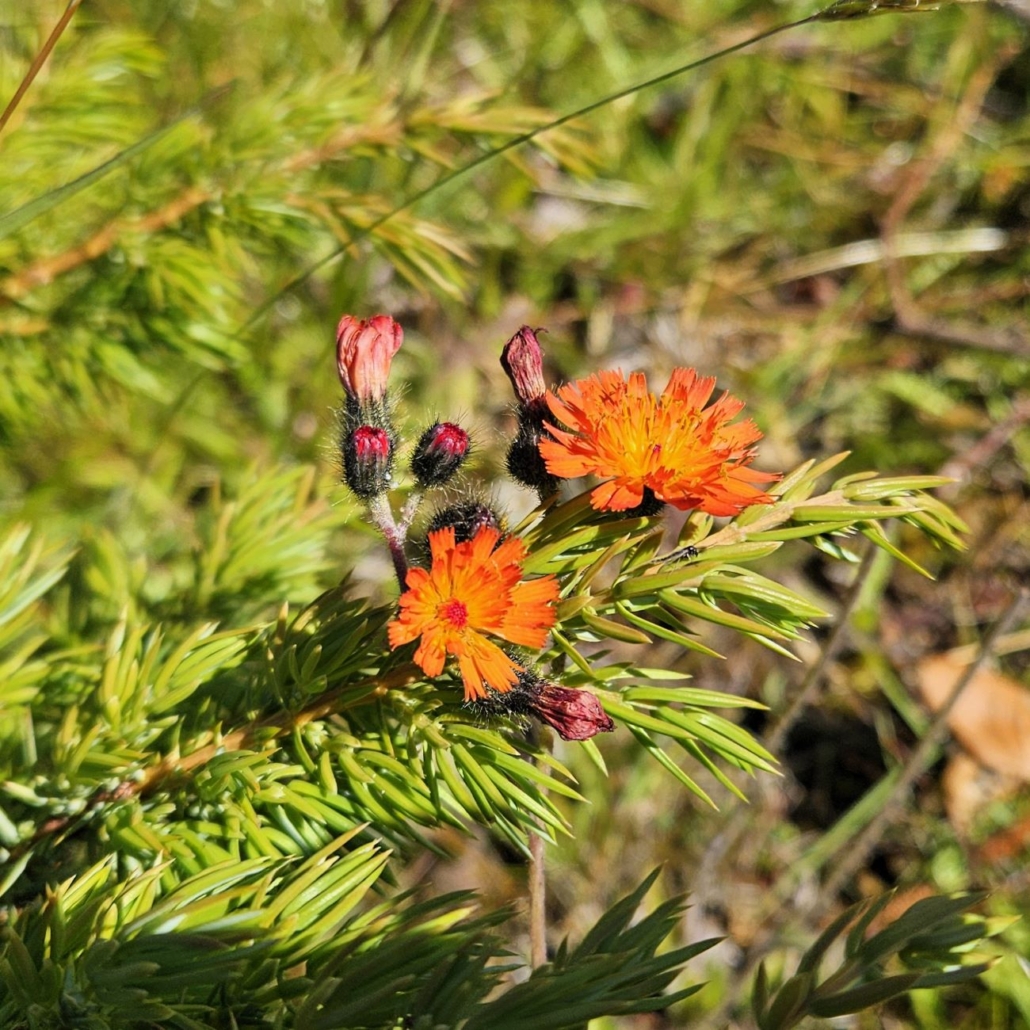 Oranssikukkainen kasvi, joka kurkisteli katajan oksien välistä, ei ollut minulle tuttu. Se on ilmeisesti oranssivoikeltano, jonka Luontoportti mainitsee olevan puutarhakarkulainen. Knoppitieto: se lisääntyy apomiktisesti eli ilman hedelmöitymistä.