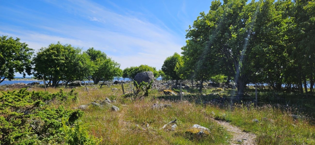 Saaren eteläkärki oli sekin aidattu. Tuskin lintujen suojelun takia - olisiko kyse enemmänkin laidunnuksesta. Laiduntavia lampaita en kuitenkaan nähnyt. Pikku luontopolku kurvaa tässä saaren kaakkoisrannan rakennusten lomaan.