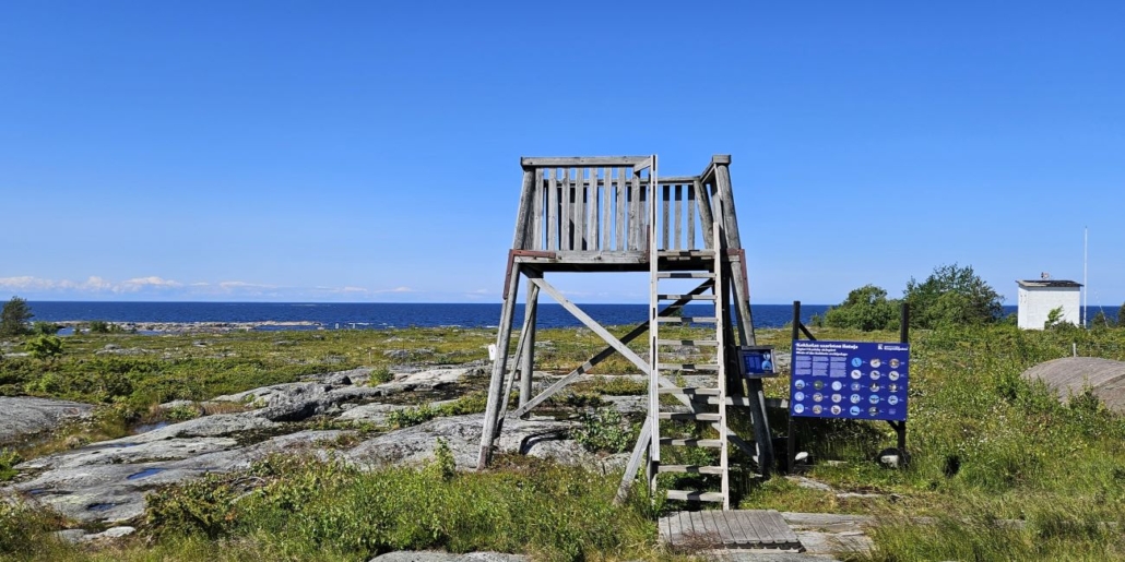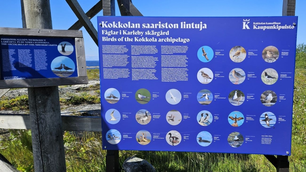 Tornin juurella on esitelty Kokkolan saariston lintuja. Erillinen taulu kertoo pohjoiskallion merikihuista. Minä olin nähnyt elämäni ensimmäisen merikihun muutamaa päivää aiemmin Perämeren kansallispuistossa. Yritin kiikaroida niitä tornista, mutta en saanut merikihua täällä bongattua.